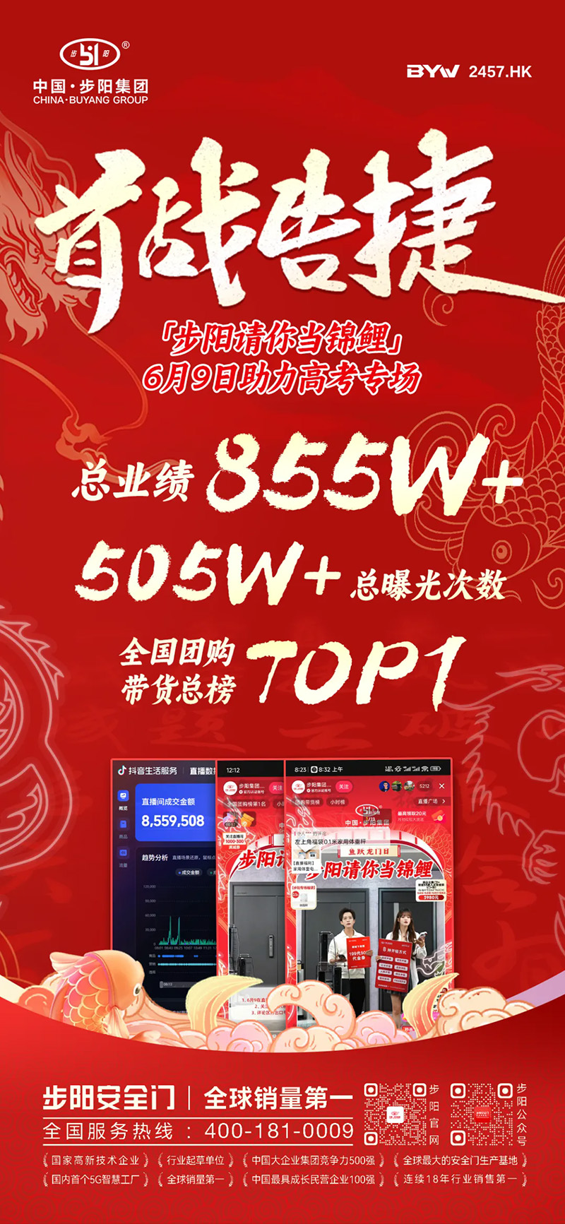 6月9日,步陽集團交出了一份引爆行業(yè)的成績單:首場專場直播僅用十小時,便創(chuàng)下驚人戰(zhàn)績——直播銷售額突破855萬+,總曝光量高達505萬+,訂單總數(shù)超3000單!憑借這一亮眼數(shù)據(jù),步陽一舉登頂全國帶貨總榜第一名,刷新門業(yè)品類直播紀錄,打響了線上渠道戰(zhàn)略轉(zhuǎn)型的漂亮一仗!