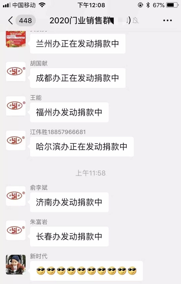 2月1日,步陽(yáng)銷售工作微信群內(nèi)活躍異常,引爆熱點(diǎn)的關(guān)鍵僅僅是一句話:“新型冠狀病毒傳播,這是一場(chǎng)沒有硝煙的戰(zhàn)役,作為步陽(yáng)集團(tuán)一份子,以我們微薄的力量吶喊加油!”鄭州、濟(jì)南、合肥、成都、福州等全國(guó)26個(gè)銷售分公司立即響應(yīng),紛紛開始自發(fā)組織捐款,參與人數(shù)超過2100多人。不到半天,來(lái)自各個(gè)分公司的捐款已經(jīng)達(dá)到130萬(wàn)元。
