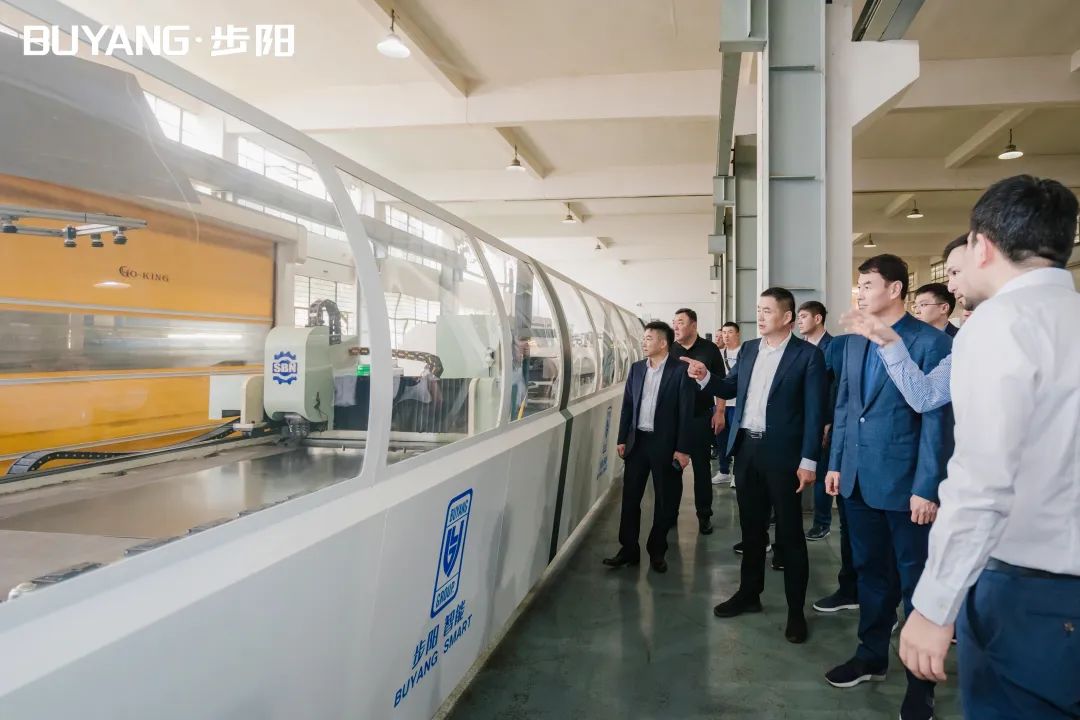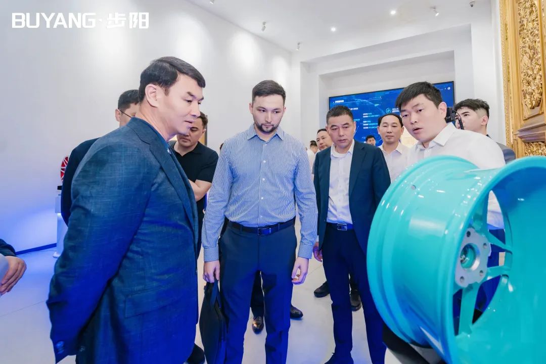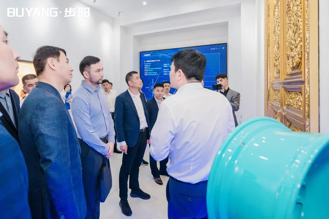 圖爾克斯坦州州長一行在集團徐步云董事長的陪同下參觀了步陽科技館、汽輪/大數(shù)據(jù)中心,步陽工匠室、5G智能流水線,并聽取公司科技創(chuàng)新、生產(chǎn)自動化的介紹解說。