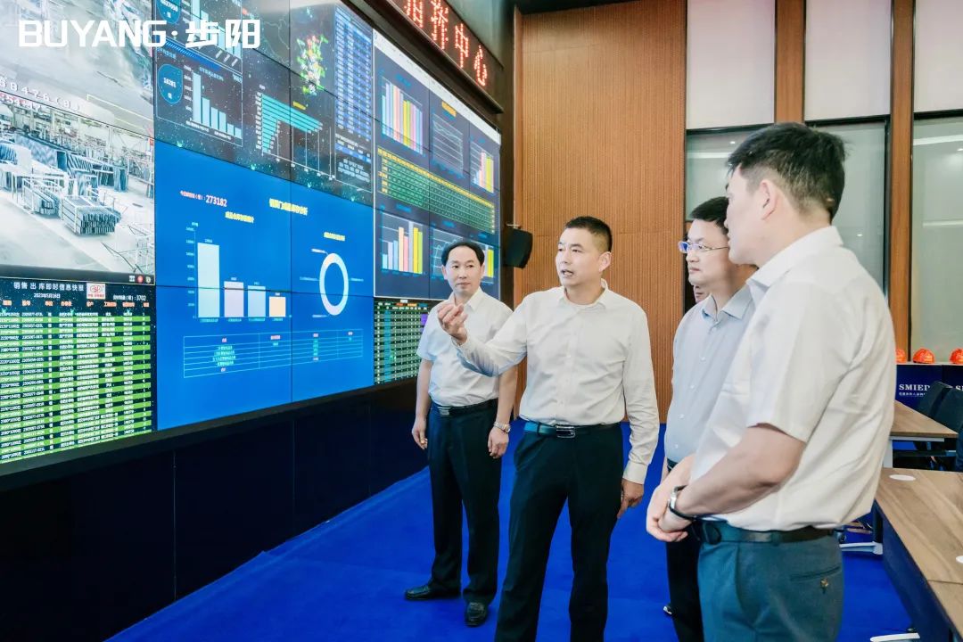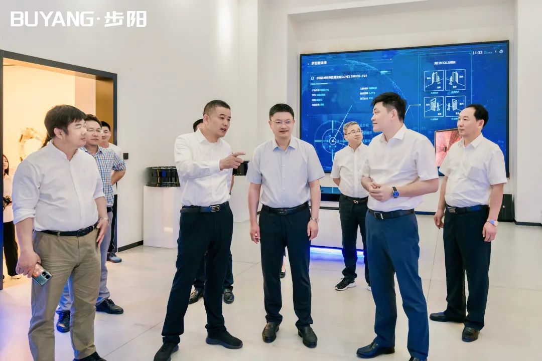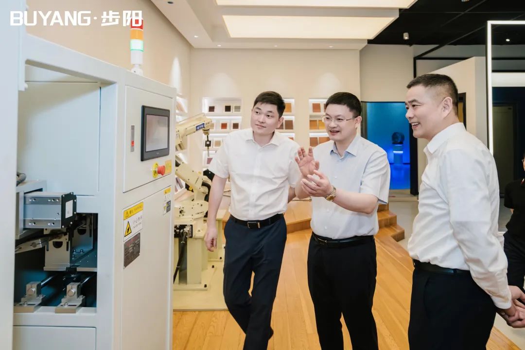 集團董事長徐步云陪同呂書記一行參觀了步陽科技館、黨建中心及門成品展廳/汽輪/大數(shù)據(jù)中心,步陽工匠室、5G智能流水線,并聽取總經(jīng)辦副總經(jīng)理朱寧介紹公司科技創(chuàng)新轉(zhuǎn)型、生產(chǎn)自動化流水線等相關(guān)介紹解說。