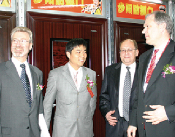 徐步云董事長(zhǎng)向海伯特先生、愛(ài)樂(lè)芬?施耐德、亞歷山大?斯彼得羅夫介紹步陽(yáng)集團(tuán)